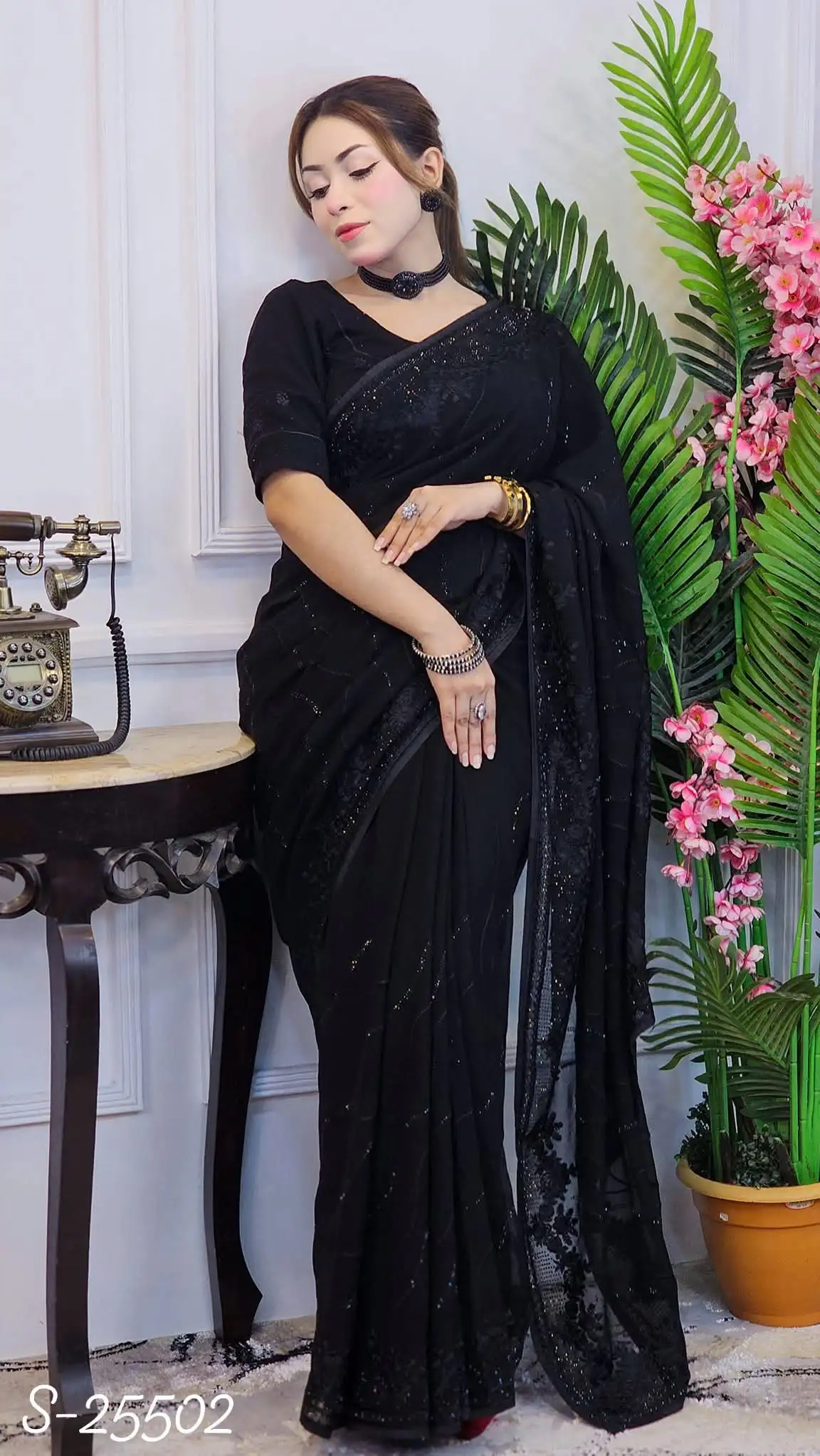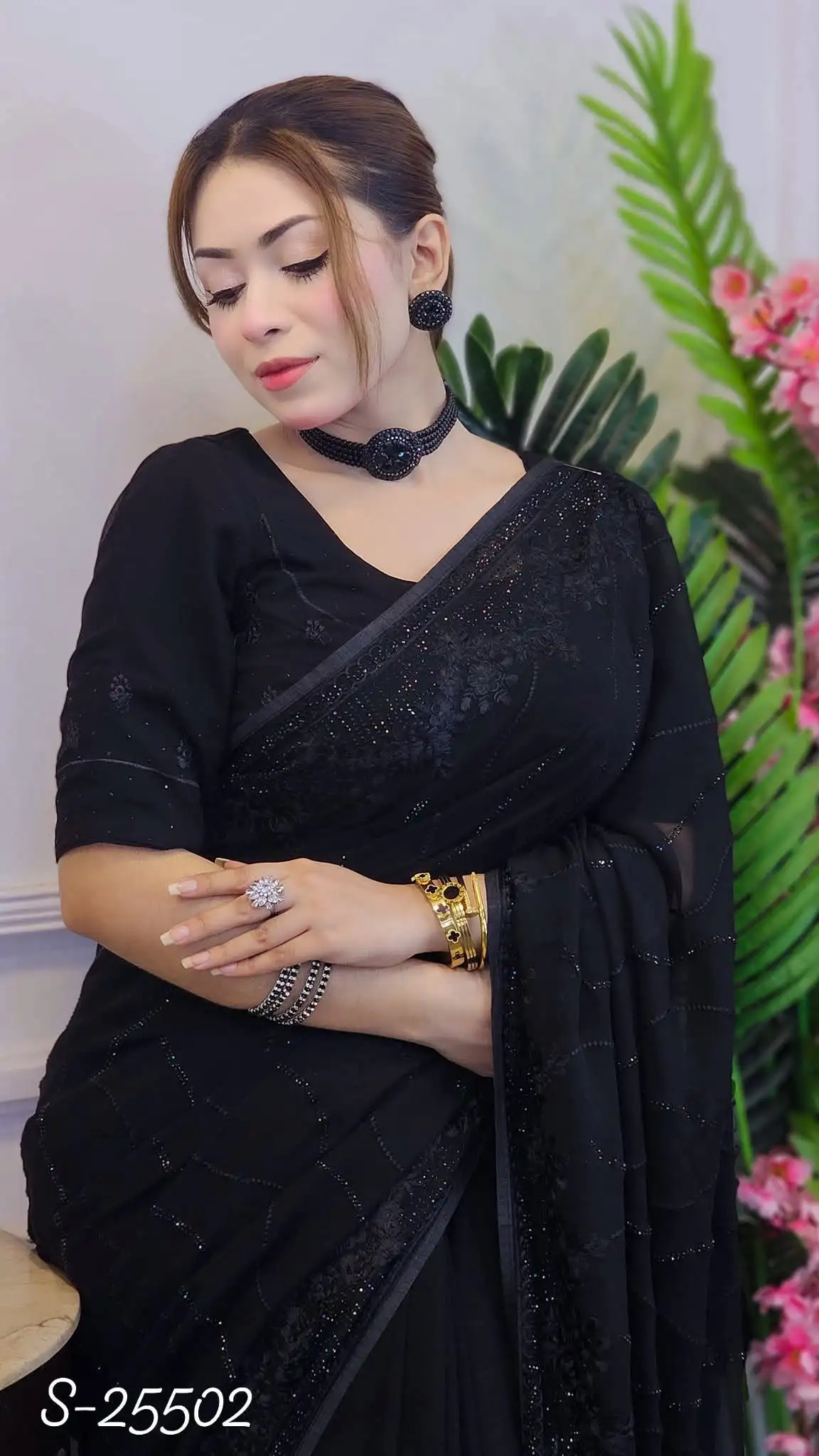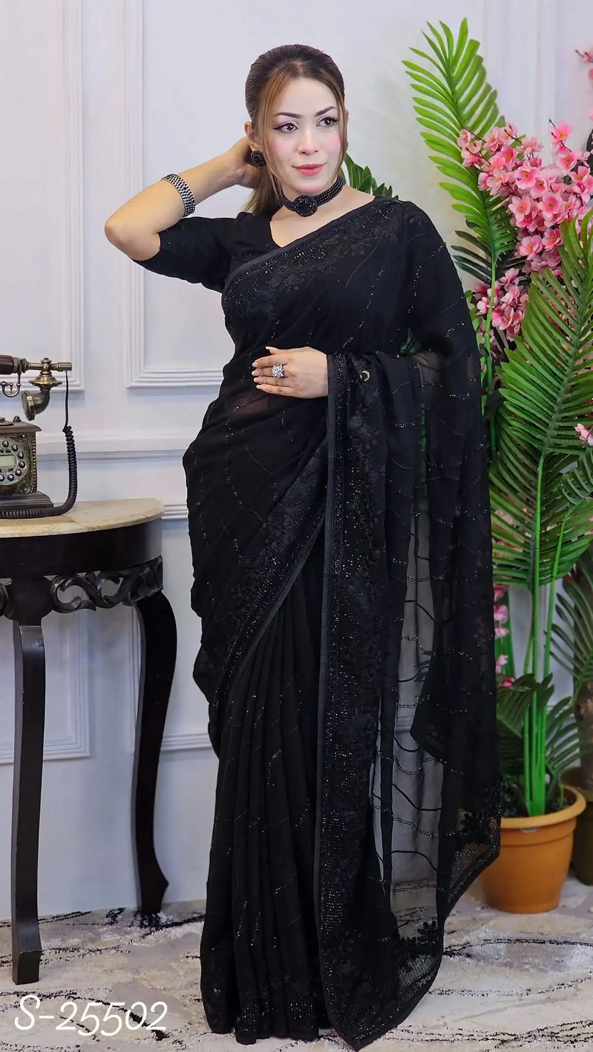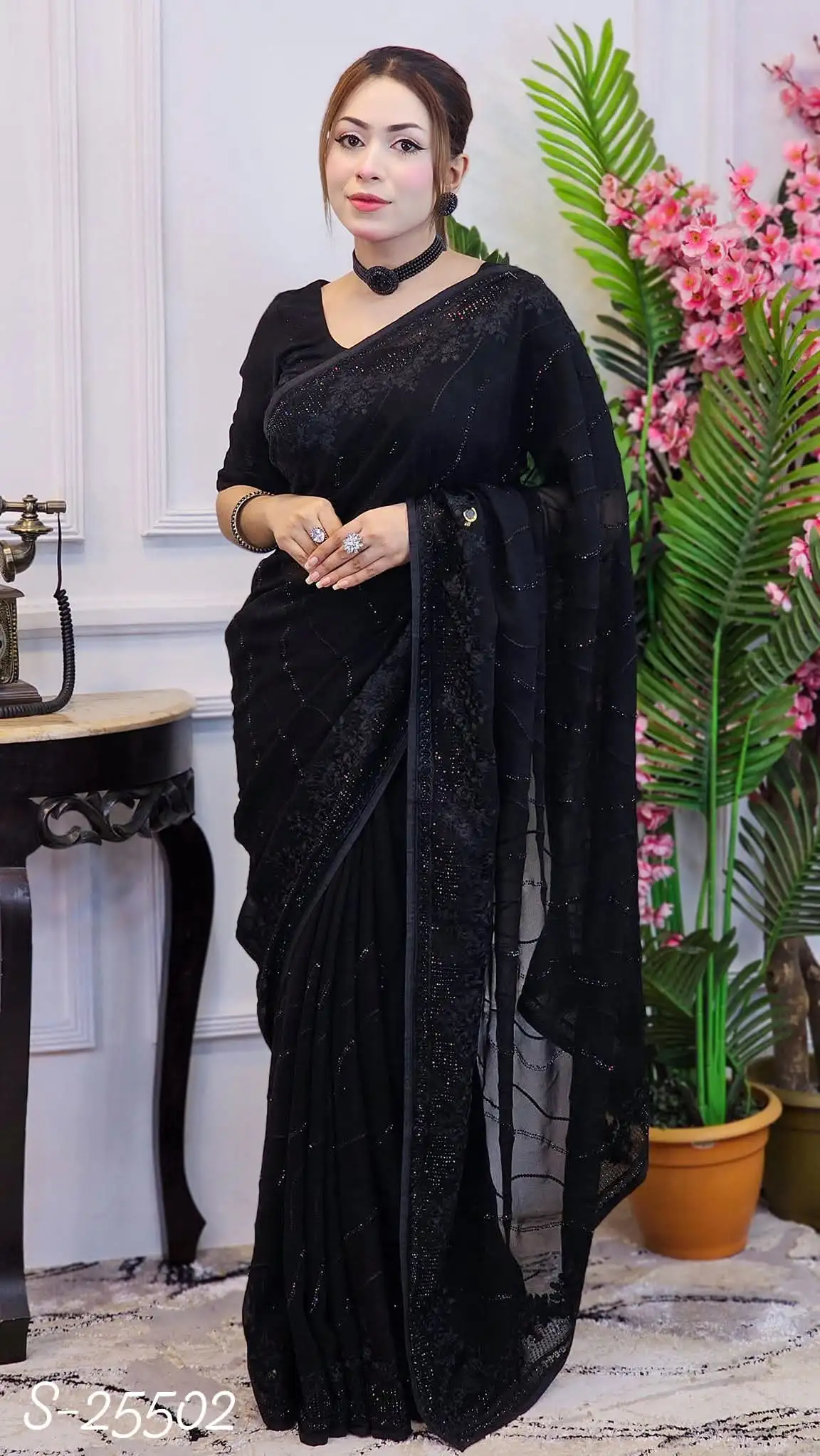 Indian weightless georgette saree featuring elegant embroidery with stone work. Comes with a matching unstitched blouse piece attached with the saree.