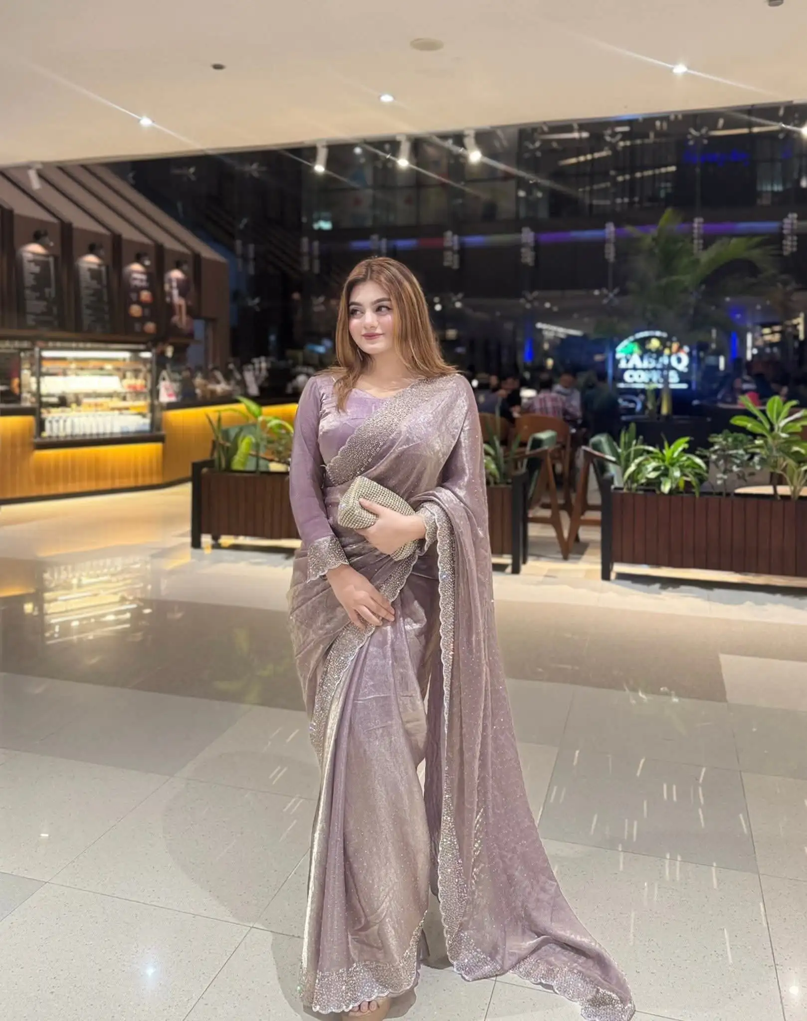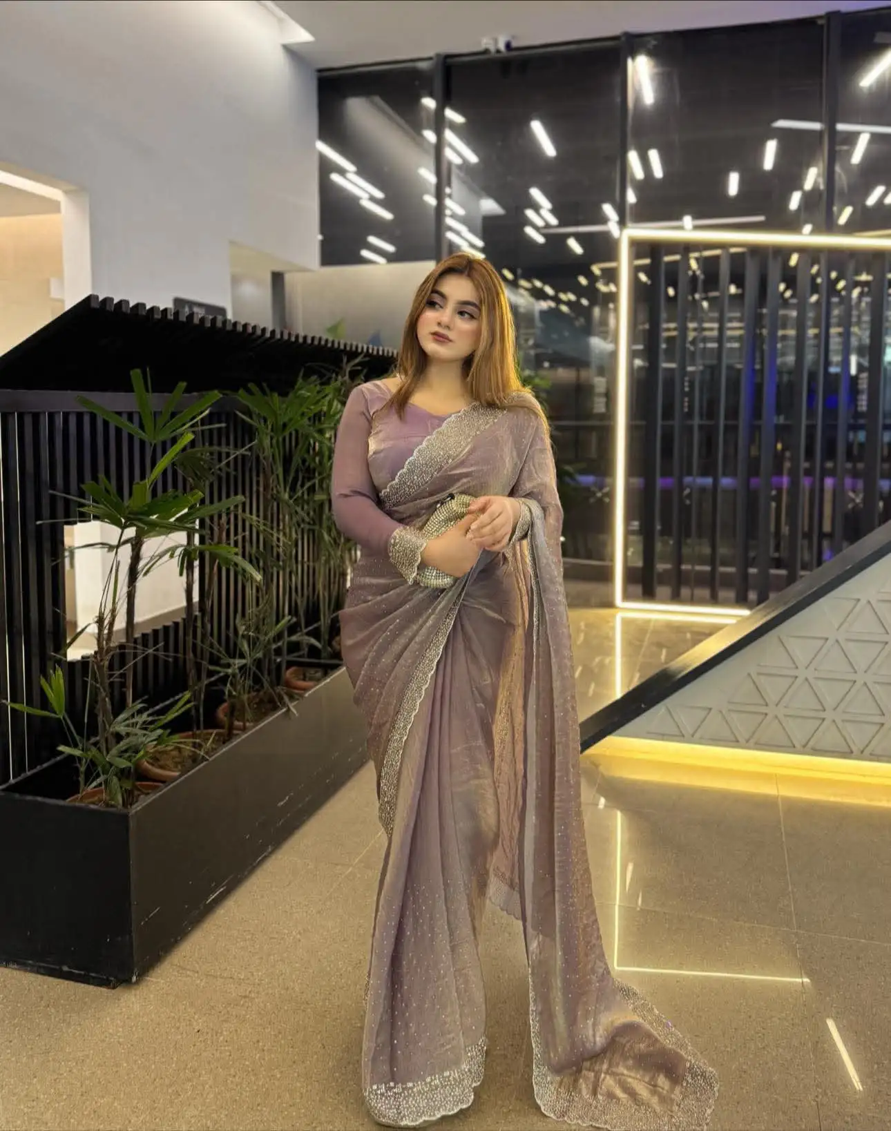 Pakistani Star georgette saree featuring elegant stone work. Comes with a matching unstitched blouse piece attached with the saree.
