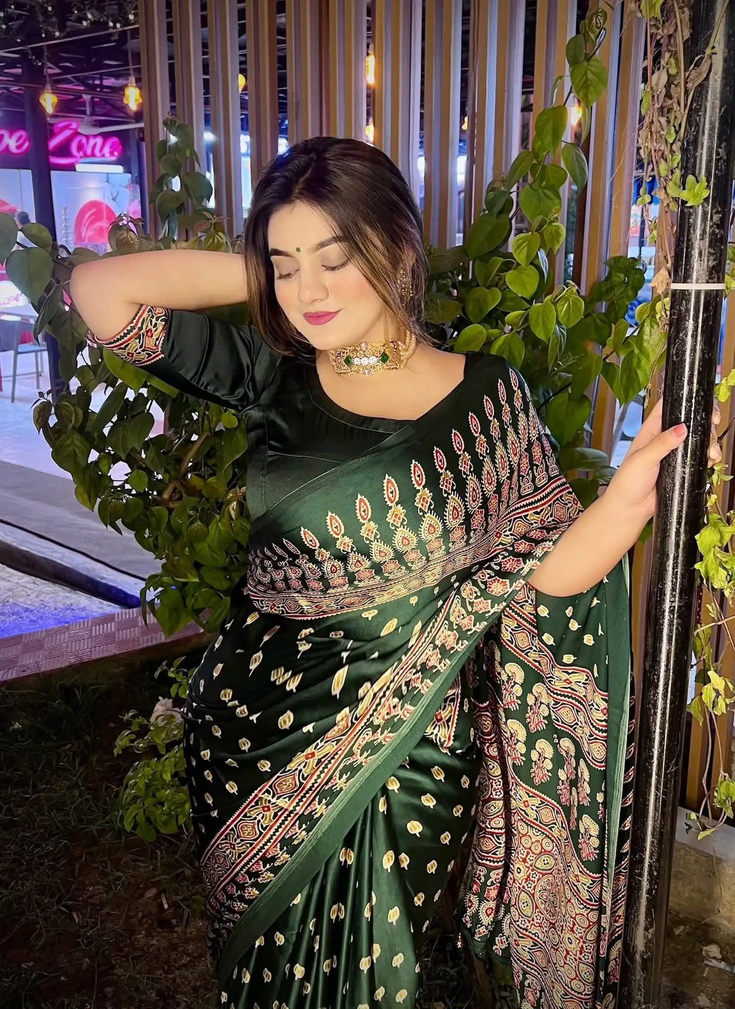 Pure Indian Ajrak modal silk saree featuring elegant printed work detailing. Comes with a matching unstitched blouse piece attached with the saree.